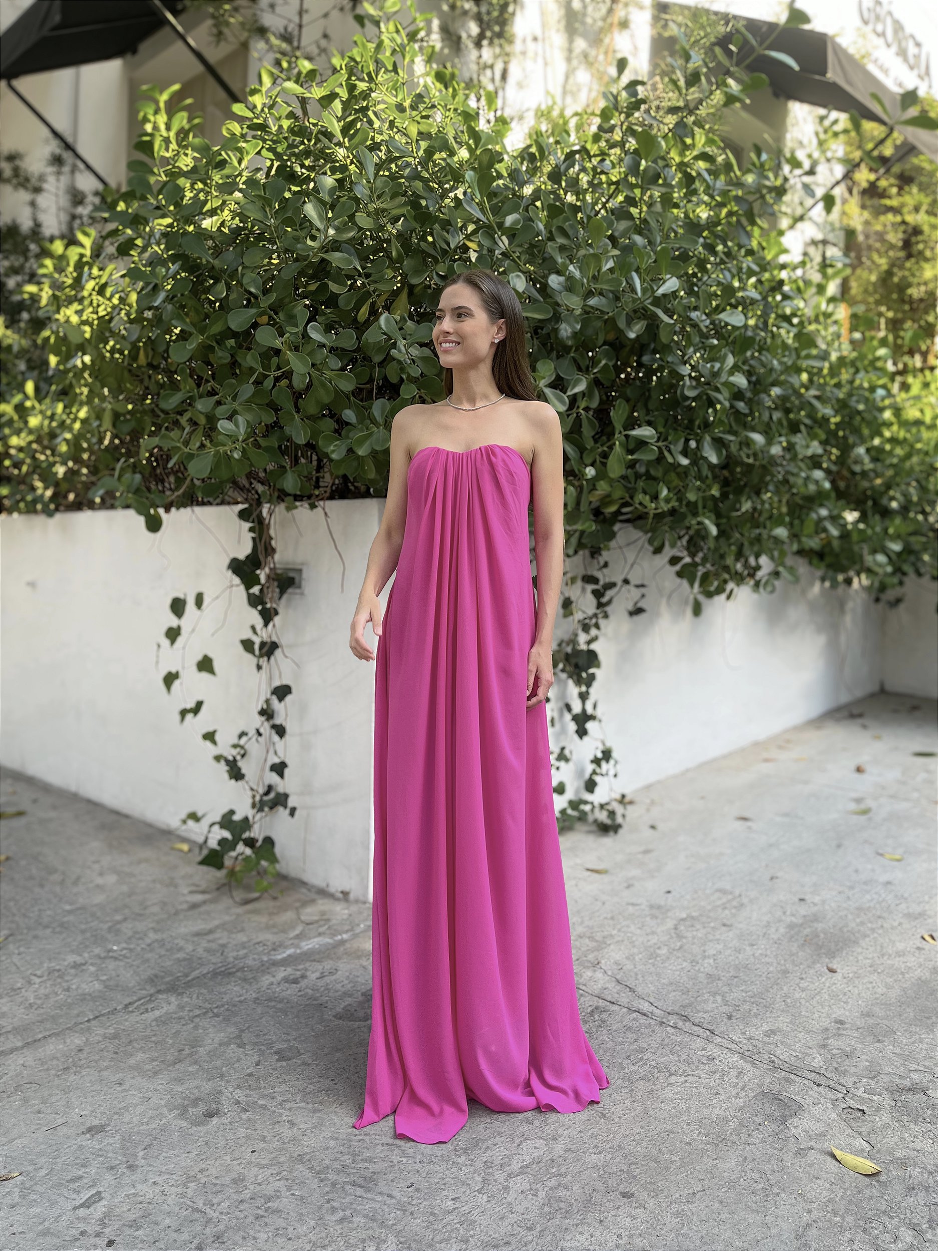 Vestido longo de tomara que caia, acompanha faixa para amarração na cintura.